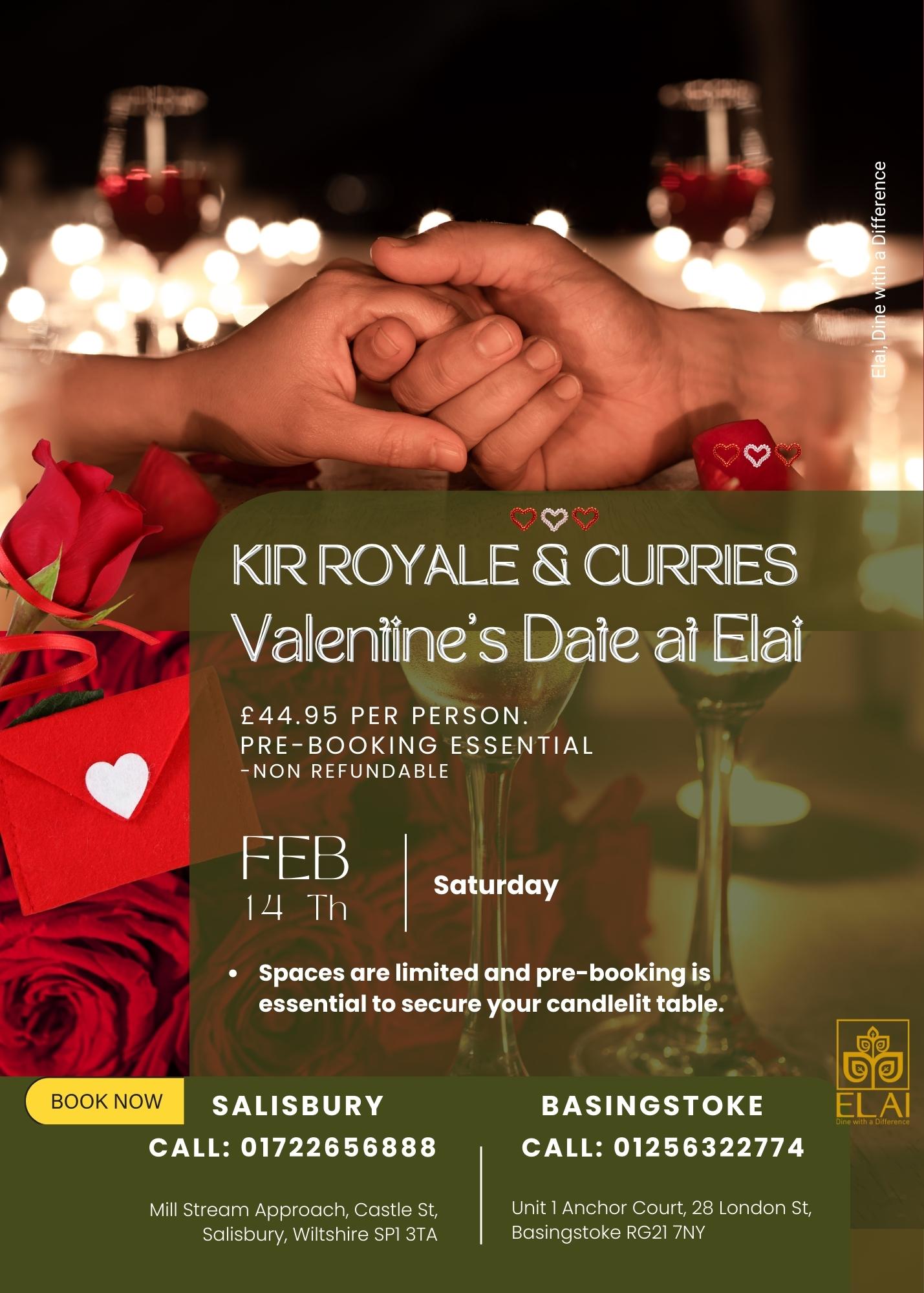 The event takes place on Saturday, 14th February at Elai Indian Restaurant, Basingstoke and Salisbury. Guests can choose their preferred location while booking.
